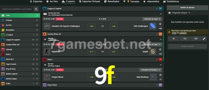 O 9f oferece uma grande seleção de opções de apostas em e-sports com probabilidades competitivas